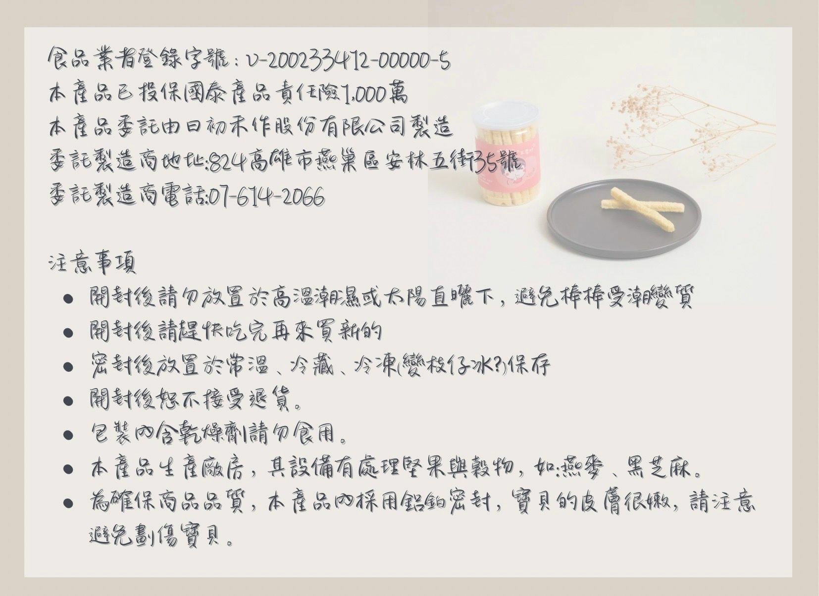 保存方式:請放置陰涼乾燥處,避免陽光照射,開封後盡速食用完畢,避免受潮